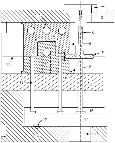 FIGURE PP.9 A two-plate injection-mold design: (1) locating ring; (2) clamping plate; (3) water channels; (4) cavity; (5) sprue bushing; (6) cavity retainer; (7) gate; (8) full round runner; (9) sprue puller pin; (10) plunger; (11) parting line; (12) ejector pin; (13) stop pin; (14) ejector housing; (15) press ejector clearance; (16) pin plate; (17) ejector bar; (18) support plate; (19) plunger retainer. |